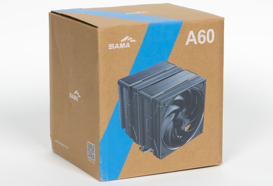 Поставляется процессорный охладитель Sama A60B в коробке из относительно тонкого картона почти без окраски. Чего в данном случае достаточно, поскольку внутри все компоненты надежно фиксируются парой «крышек» из вспененного полиэтилена. Сам главный герой изображен прямо на коробке, так что не перепутаешь — хотя названия на лицевой поверхности и в спецификациях сзади немного различаются. В нашем случае, как несложно догадаться, речь идет о модели черного цвета, но есть в ассортименте Sama и белый A60W, и некрашеные A60L и A60E (в первом используются вентиляторы с подсветкой). A60B на коробке спереди промаркирован как просто A60, но картинка именно такая, какой должна быть.