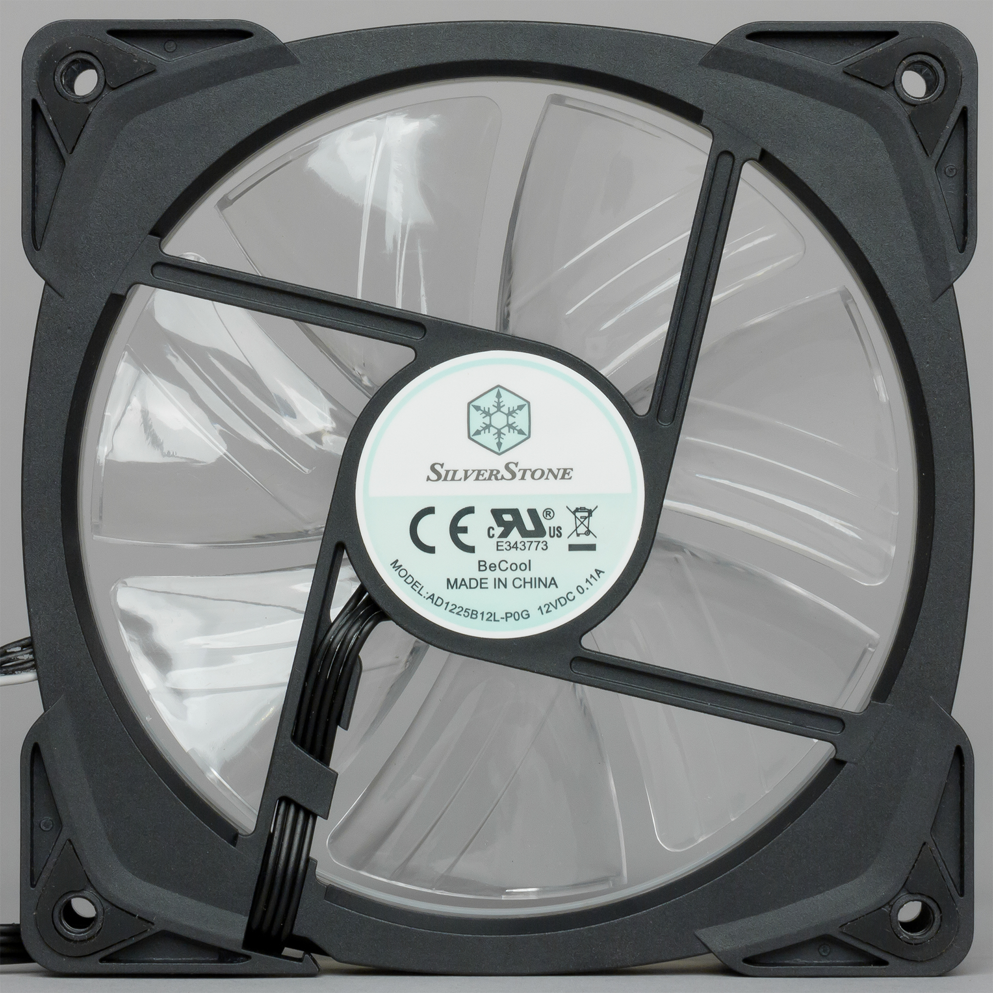 Рамка вентилятора изготовлена из прочного черного пластика. Спереди на рамке закреплен светорассеиватель из белого полупрозрачного пластика. Крыльчатка вентилятора изготовлена из прозрачного пластика. Светорассеиватель прикрывает вмонтированные с равным шагом многоцветные светодиоды (всего 18 штук). Светодиоды подключены четырехжильным проводом (+12 В, G, R, B) и управляются синхронно. На проушины в углах рамки вентилятора наклеены виброизолирующие накладки из резины средней жесткости. В несжатом состоянии накладки выступают примерно на 0,6 мм. По замыслу разработчиков, это должно обеспечивать виброразвязку вентилятора от места крепления. Однако если прикинуть соотношение массы вентилятора к жесткости накладок, то становится понятно, что резонансная частота конструкции получается очень высокой, то есть практически никакой эффективной виброразвязки быть не может. Кроме того, гнёзда, куда вворачиваются крепежные саморезы, являются частью рамки вентилятора, поэтому вибрация от вентилятора будет через саморезы без помех передаваться на то, на чем закреплен вентилятор. В итоге такую конструкцию проушин можно рассматривать только в качестве элемента дизайна вентилятора. Маркировка на вентиляторе позволяет определить, что используется модель AD1225B12L-P0G.