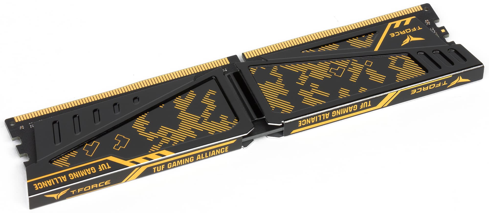 В серию Vulcan TUF Gaming Alliance DDR4 входят комплекты памяти с частотой 3600, 3200, 3000 и 2400 МГц. Все комплекты состоят из двух модулей, модули могут иметь емкость 8 или 16 ГБ. В нашем случае комплект состоял из двух модулей DDR4-3200 по 8 ГБ. Отличительной особенностью этих модулей памяти является наличие радиаторов с камуфляжной расцветкой. На сайте производителя указано, что это «высокоэффективные кованые радиаторы с современным асимметричным дизайном». Круто! Мы, правда, не поняли, в чем заключается асимметрия радиаторов и чем это лучше.