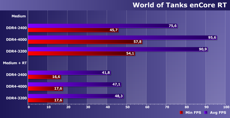 Тут немного другая ситуация: DDR4-2400 уже не подойдет. «Приварок» от разгона памяти по-прежнему составляет порядка 25%, но здесь они нужнее и в какой-то степени позволяют «замахнуться» на среднее качество — чего даже «отборная» DDR4-3200 не дает.