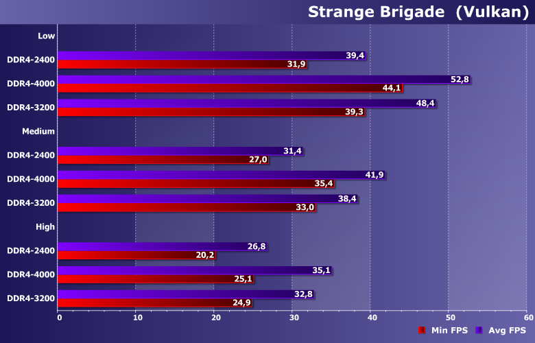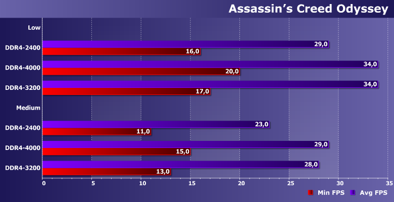 Также здесь нужно еще заслужить хотя бы «низкие» настройки — по-хорошему, это не удалось никому из испытуемых. В принципе, при быстрой памяти можно попробовать играть в таком режиме, но удовольствия это не доставит. Значит, опускаемся на минимальный уровень качества, где DDR-2400 проявляет себя так же, как «нормальная» память при низком качестве. Дополнительные комментарии, думаем, излишни.