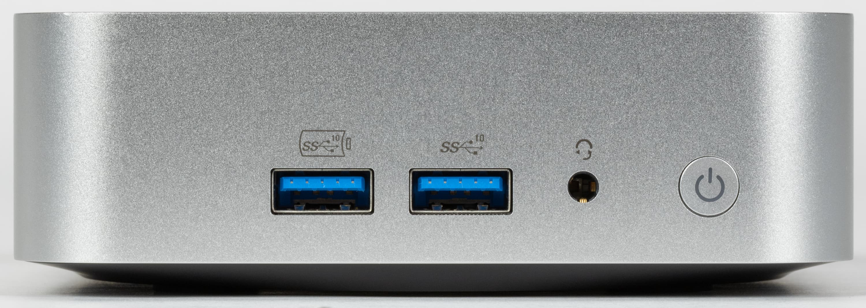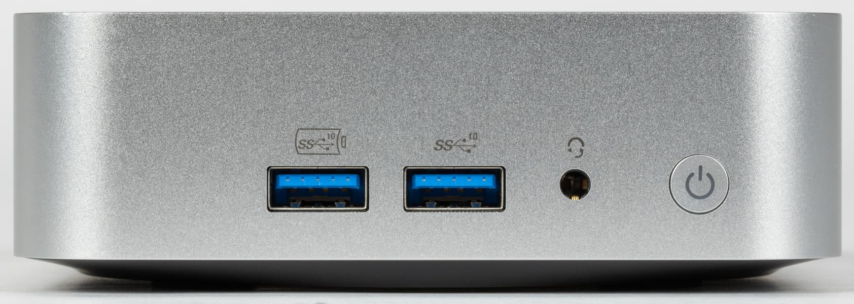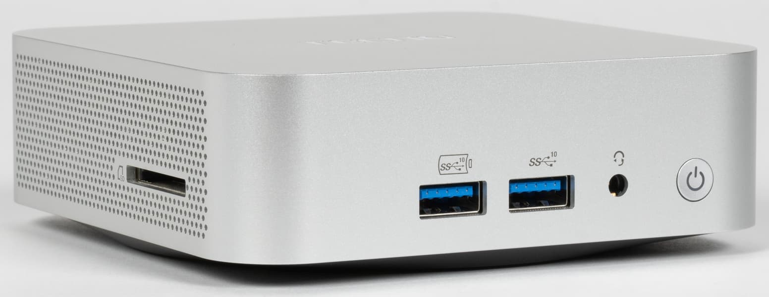 Посмотрим на него более внимательно. На передней панели находятся два порта USB3 Gen2, один из которых по совместительству умеет заряжать мобильные устройства и при «выключенном» ПК, разъем под гарнитуру и кнопка включения питания. Стандартная претензия — нет ни одного порта Type-C; желательно высокоскоростного. Но ее можно тоже сразу отправлять в Intel — как уже сказано, здесь всё «срисовано» с последних NUC один к одному. Некоторые производители от базовых концепций отходят, некоторые не рискуют.