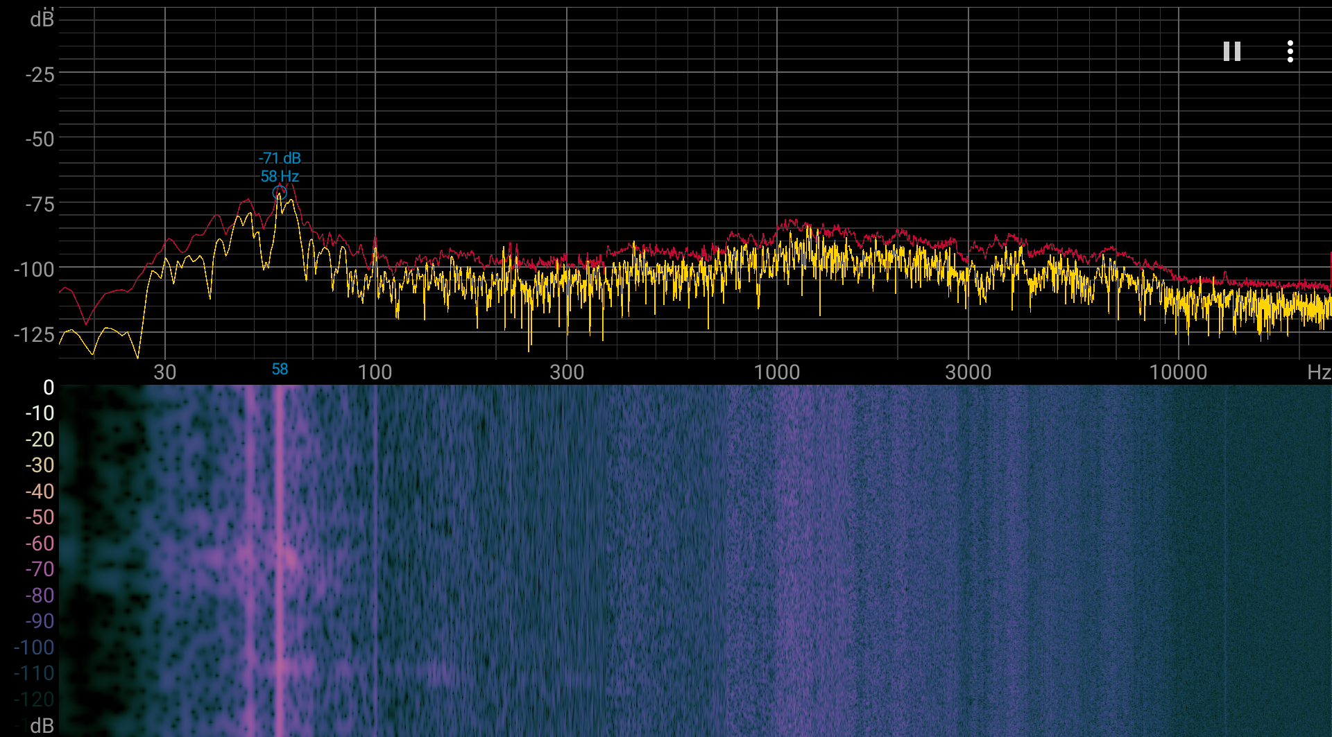 В целом этот ПК не является шумным устройством. Даже под максимальной нагрузкой характер шума более-менее ровный и раздражения не вызывает, но неприятно то, что с периодичностью в минуту или около того шум то повышается, то понижается. Спектрограмма, полученная при максимальной нагрузке на процессор (период с 33,8 дБА), в основном ровная, и в диапазоне частот, где звуки могут вызывать особенное раздражение, выраженных пиков нет (низкочастотными пиками можно пренебречь):