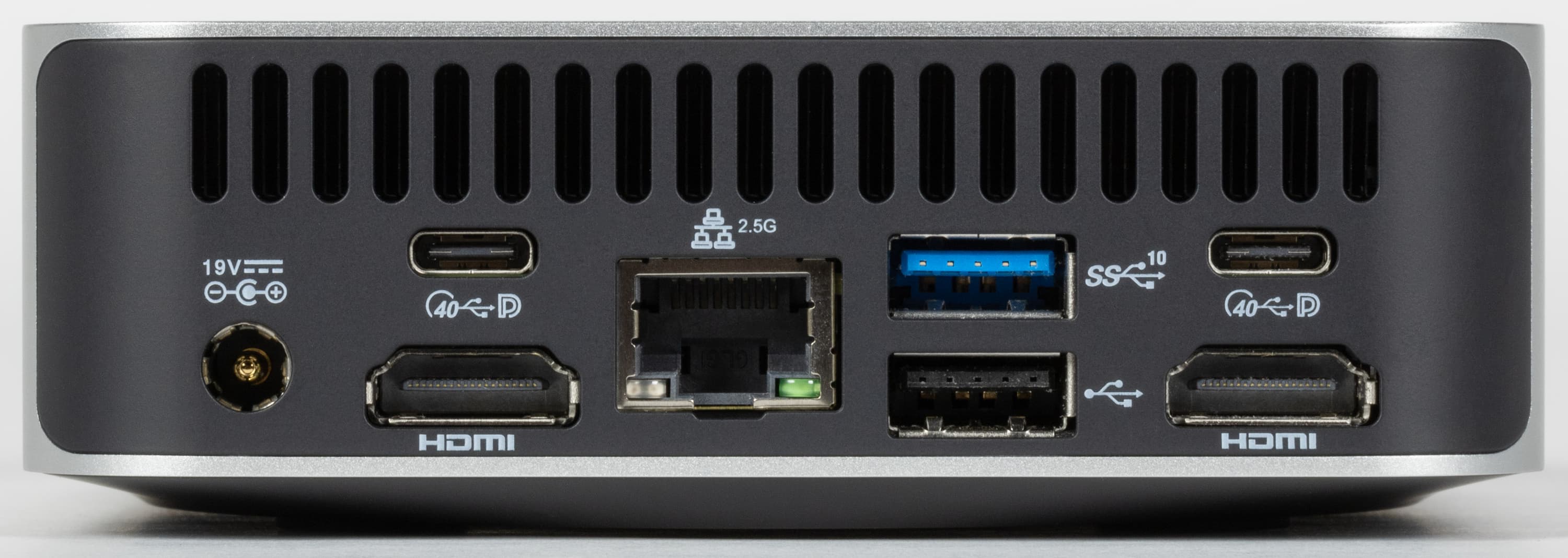 Взгляд на заднюю панель приводит к тому же выводу — изменений по сравнению с NUC никаких. С другой стороны, тут и менять-то нечего. Есть еще один USB3 Gen2 Type-A и классический USB 2.0, пара HDMI и Ethernet на 2,5 Гбит/с — дань совместимости. А данью современности являются два порта Thunderbolt 4. Компания, правда, именует их USB4, что не совсем соответствует действительности, хотя на данный момент для покупателя разницы никакой, да и в будущем ее вряд ли удастся заметить. Просто потому, что производители периферии — не самоубийцы, чтобы выпускать что-то исключительно под родные режимы USB4, отказываясь при этом от поддержки всё еще куда более распространенного Thunderbolt. Но не придраться к этому моменту мы, естественно, не можем.