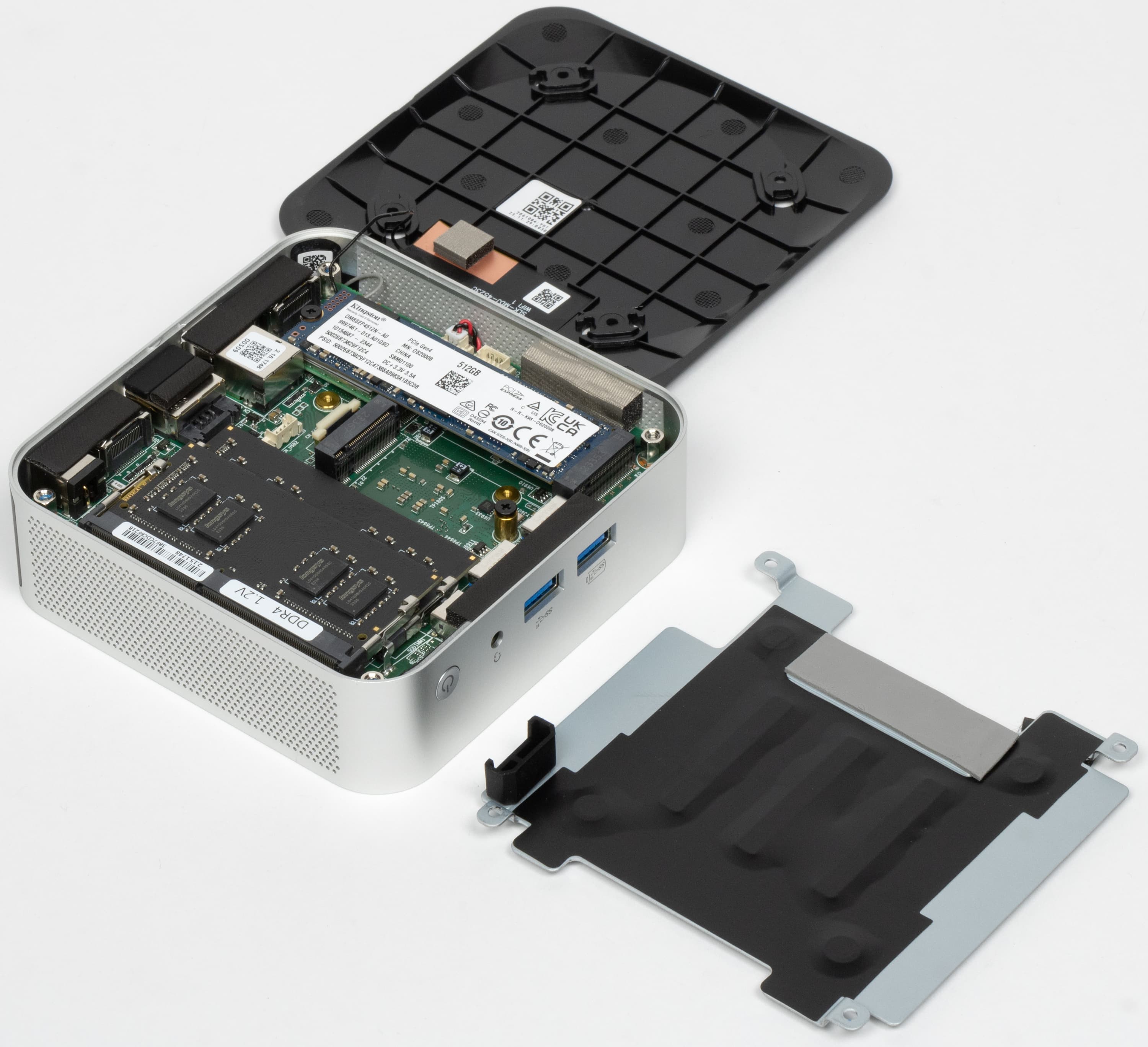 Система хранения данных представлена двумя слотами М.2 — 2280 и 2242. Первый поддерживает SSD с интерфейсом PCIe Gen4. Штатно занят Kingston OM8SEP4512N на 512 ГБ — с которым мы уже знакомы. К сожалению, поскольку это очень дешевое решение на контроллере Silicon Motion SM2267XT и 144-слойной QLC-памятью Intel. Впрочем, даже в рознице встречаются аналогичные, а то и хуже. И вообще это уже второй мини-ПК с этим SSD, побывавший у нас. С основными задачами справляется — если же нужно что-то большее (по емкости или скорости — неважно), то заменить не представляет сложностей.
