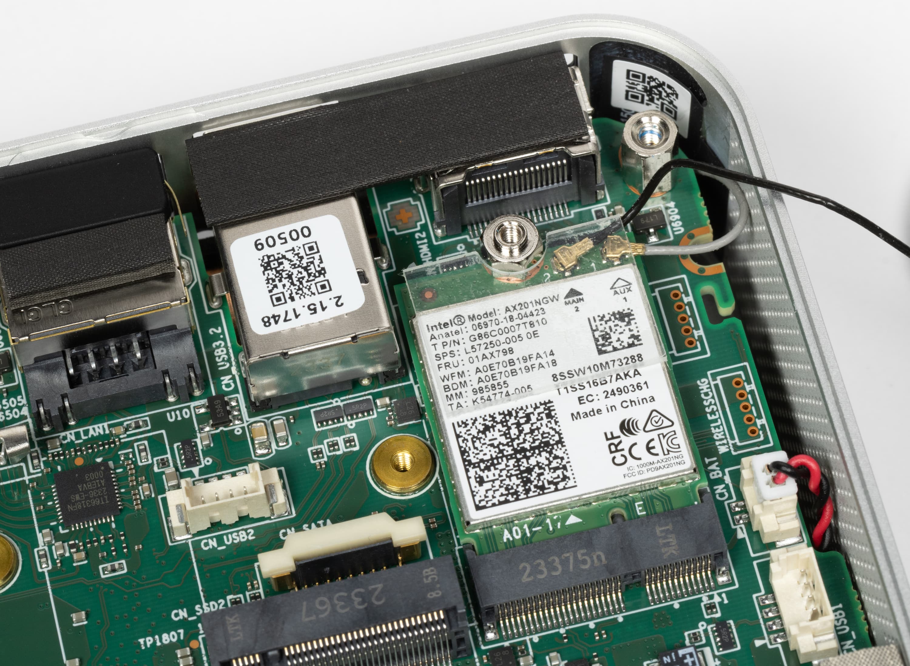 Слот для беспроводного адаптера прячется под слотом для основного SSD — тоже стандартная практика. Так что таковой можно будет тоже поменять, если понадобится, хотя менять штатный Intel AX201NGW (с поддержкой Wi-Fi 6 и Bluetooth 5.2) как нам кажется не понадобится до окончания срока жизни всего компьютера.