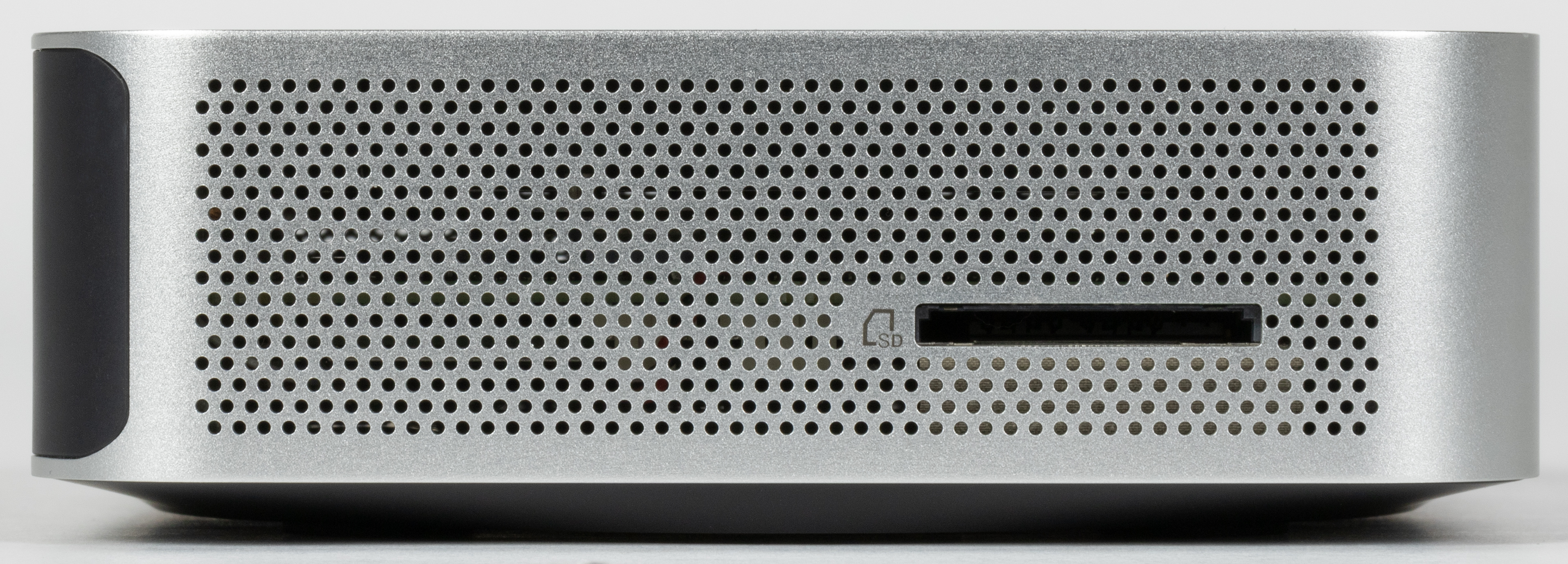 На левой (со стороны лица) грани обнаружился еще один привычный элемент — картовод для полноразмерных SDXC. В быту в последнее время более распространены микрокарты, так что для них потребуется переходник, но такое решение универсальнее. И привычно не только наличием, но и функциональными возможностями — всего лишь UHS-I ограничивает скорость карт значениями примерно 100 МБ/с. С другой стороны, более быстрые стандарты всё равно особого распространения не получили, а дареному коню в зубы не смотрят. Отдельный картовод не нужен, встроенный обеспечивает нормальную производительность (в некоторых попадавших к нам в руки моноблоках, например, работа с картами «висела» на USB 2.0 — то есть была раза в три более медленной) — чего и достаточно.