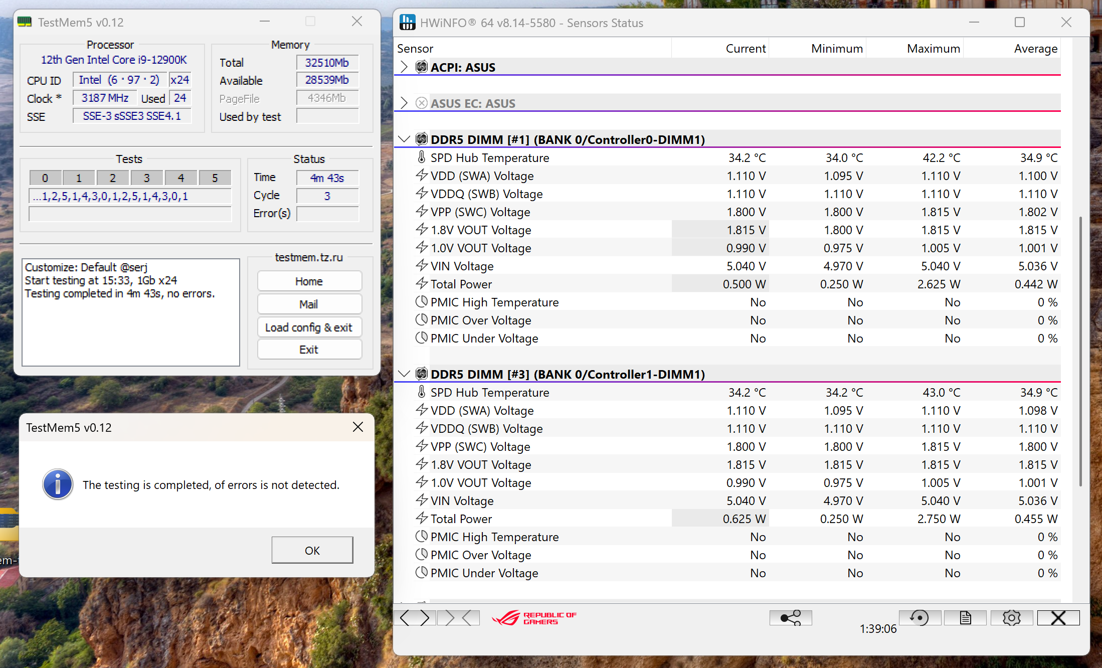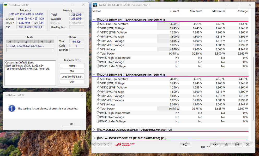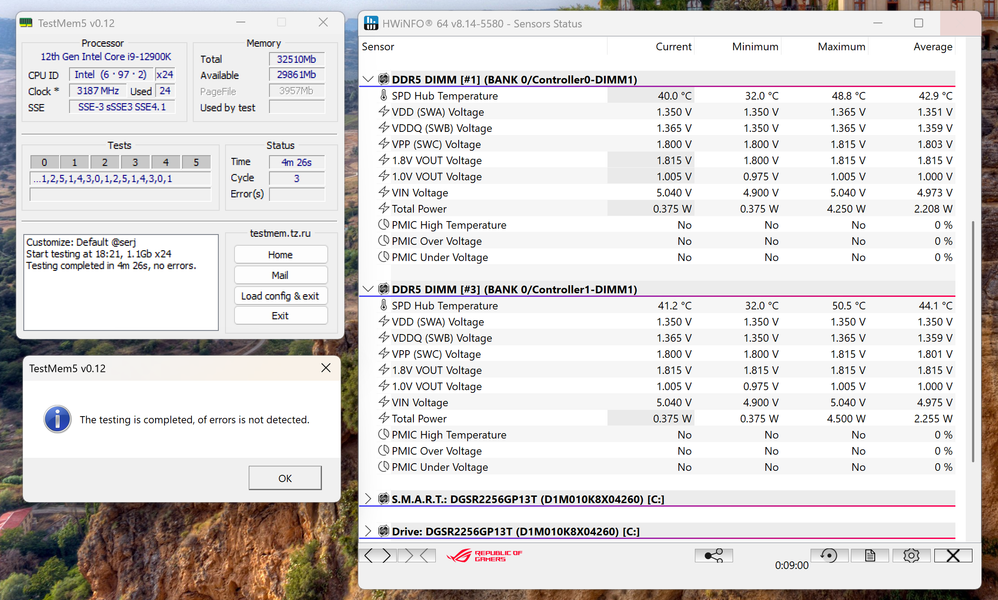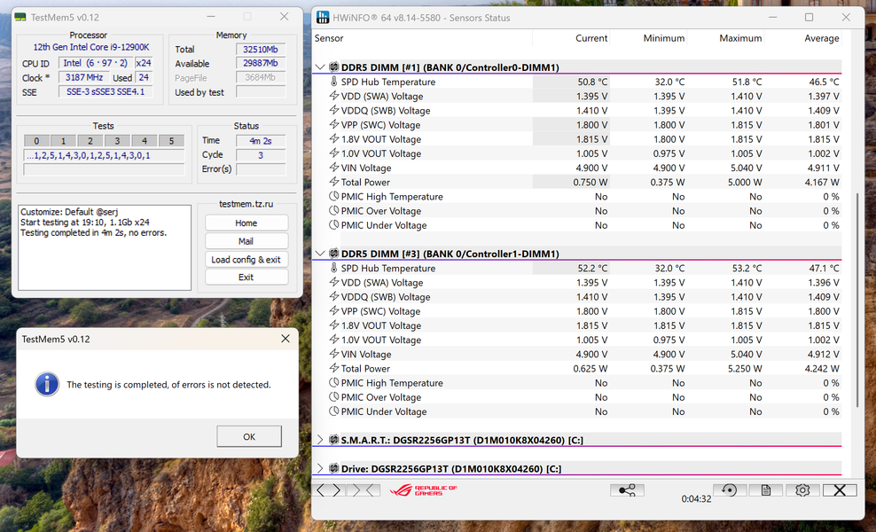 Второй из штатных профилей также отрабатывает без ошибок. Правда чуть более высокое напряжение повышает энергопотребление модуля до 4,5 Вт, а температуру в «плохом» случае до 50,5 °C. Официально DDR5 может функционировать при температуре до 85 °C, на практике нежелательно превышать 60 °C, но и до этой границы далеко — что-то придумывать дополнительно с охлаждением не требуется.