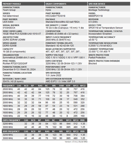 Но для начала немного диагностики при помощи Thaiphoon Burner. Обратить внимание тут стоит на два момента. Во-первых, TeamGroup традиционно не ограничивается младшими профилями JEDEC, что правильно — например, этот комплект и по-умолчанию будет работать как DDR5-5200 хотя бы. Правда TeamGroup T-Force Xtreem ARGB, например, делает это же на частоте 5600 МГц, но для Eco-линейки подобные частоты уже могут быть и вовсе целевыми. Во-вторых, мы наконец-то столкнулись с профилями AMD EXPO. Ранее не раз упоминания о их поддержке были, но Thaiphoon Burner их не находил. Так что начало уже казаться, что это либо проблемы утилиты, либо на платформе Intel «не видны». Оказалось, что ни то, ни другое — поскольку сейчас всё волшебным образом заработало.