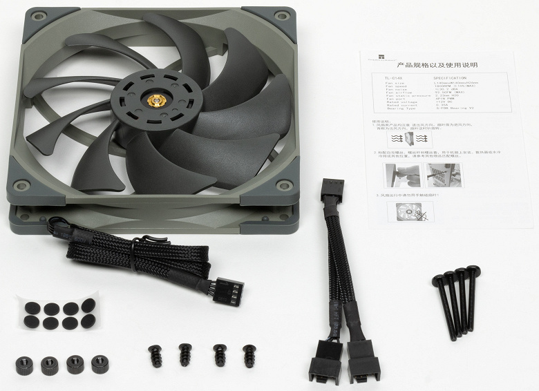 В комплект поставки входят четыре самореза (для установки вентиляторов в корпус), четыре длинных винта М3 для крепления к радиатору СЖО или к корпусу, четыре гайки и восемь резиновых прокладок. А также разветвитель питания и что-то типа руководства на китайском языке.