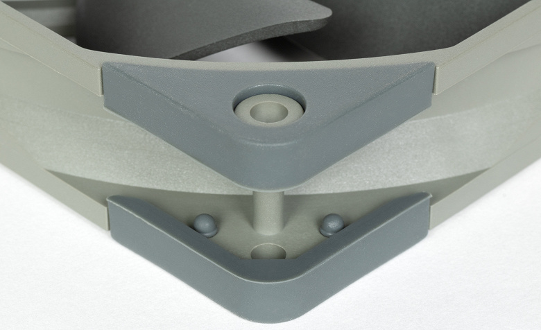 По замыслу разработчиков, это должно обеспечивать виброразвязку вентилятора от места крепления. Однако если прикинуть соотношение массы вентилятора к жесткости накладок, то становится понятно, что резонансная частота конструкции получается очень высокой, то есть практически никакой эффективной виброразвязки быть не может. Кроме того, гнезда, куда вворачиваются крепежные саморезы, являются частью рамки вентилятора, поэтому вибрация от вентилятора будет через саморезы без помех передаваться на то, на чем закреплен вентилятор. В итоге, такую конструкцию проушин можно рассматривать только в качестве элемента дизайна вентилятора.