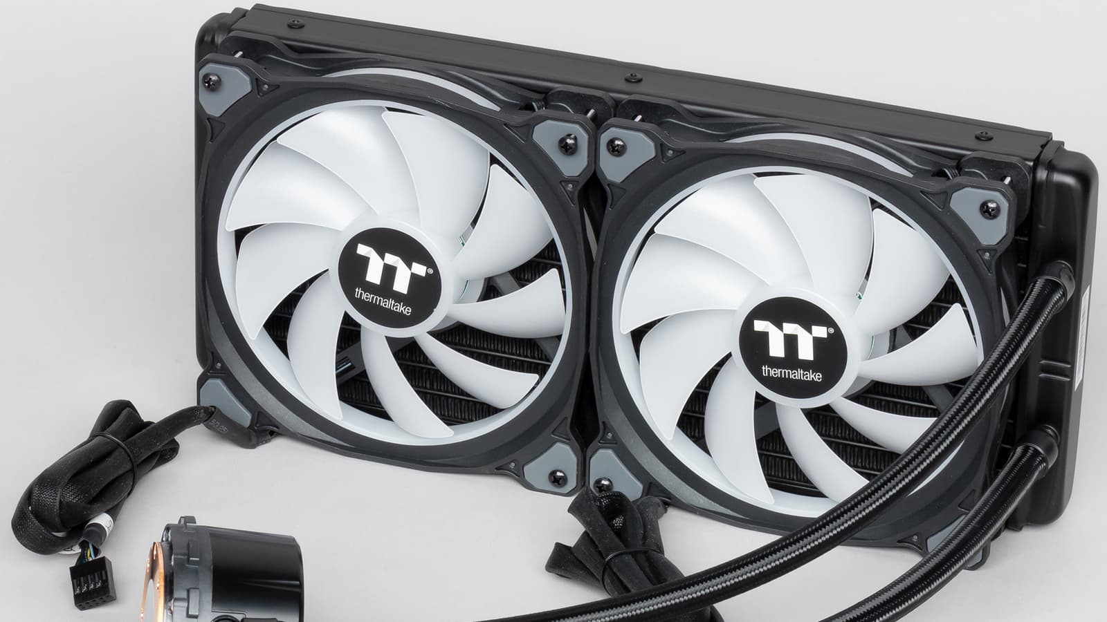 Радиатор изготовлен из алюминия и снаружи имеет черное матовое относительно стойкое покрытие. Габариты радиатора — 312,5×140×27 мм. Максимальная толщина радиатора с закрепленными вентиляторами составляет 56 мм (по выступающим частям). Отметим, что при желании на радиатор с другой стороны можно установить еще пару вентиляторов, и, если они будут из этой же серии, то ими можно будет управлять контроллером из комплекта, в котором остаются незадействованными два разъема. Система в сборе с крепежом под LGA 2011 имеет массу 1352 г, только радиатор и помпа, соединенные шлангами, — 807 г, один вентилятор — 224 г.
