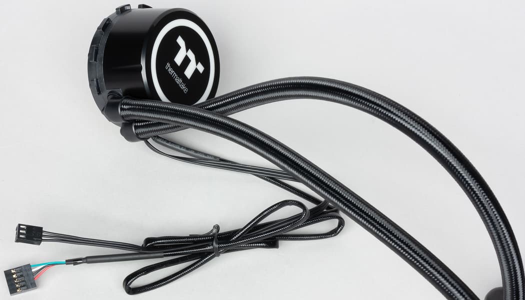 Верхняя часть крышки подсвечивается изнутри многоцветной подсветкой, состоящей из шести независимых зон (используются RGB-светодиоды с адресацией, расположенные по кругу). Отметим, что помпа имеет байонетный крепеж, который используют ряд производителей систем охлаждения. Диаметр помпы по выступающим ушкам байонета составляет 72 мм, а без них 66 мм, а высота от подошвы теплосъемника — 44 мм. Длина кабеля к разъему для вентилятора на материнской плате 29 см, а кабеля подсветки в пластиковой оплетке — 88 см. Отметим, что оплетка имеет напоминающую каучук пропитку, поэтому кабель в ней за все цепляется. Шланги имеют длину 30,5 см (относительно короткие, что сужает варианты по установке), внешний диаметр шлангов примерно 10,5 мм. Шланги заключены в скользкую оплетку. Г-образные фитинги на входе в помпу поворачиваются, что облегчает установку системы.