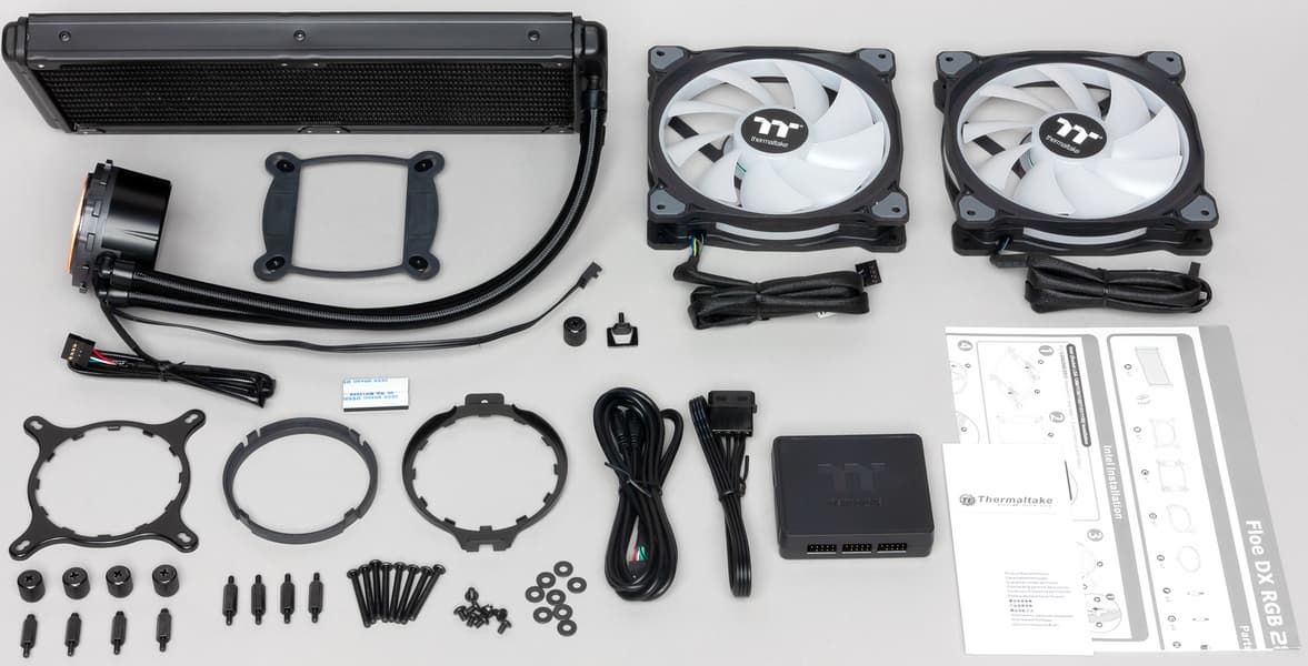 Внутри находятся радиатор с подключенной помпой, вентиляторы, комплект крепежа, контроллер и кабели к нему, а также инструкция по установке и описание гарантии.