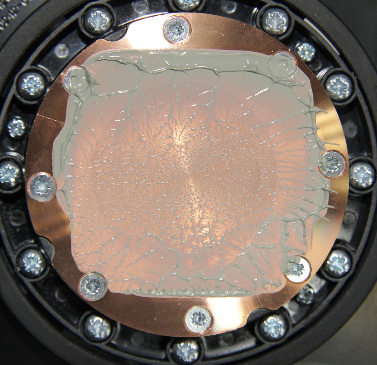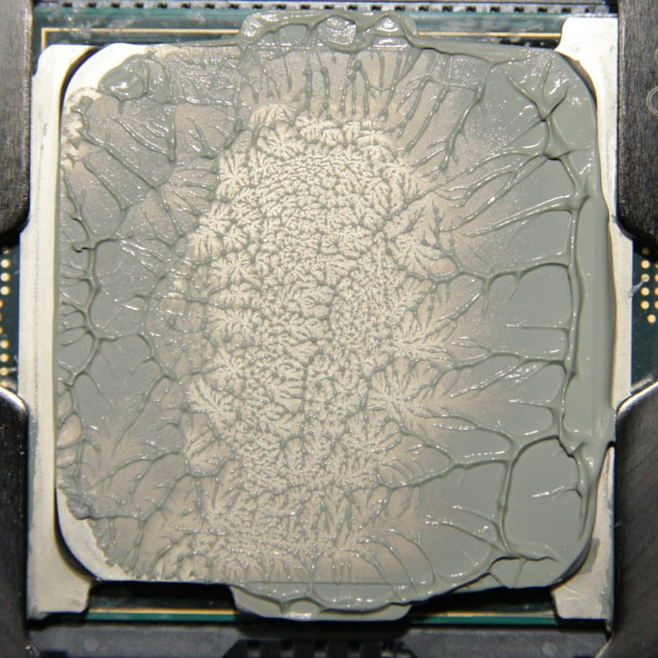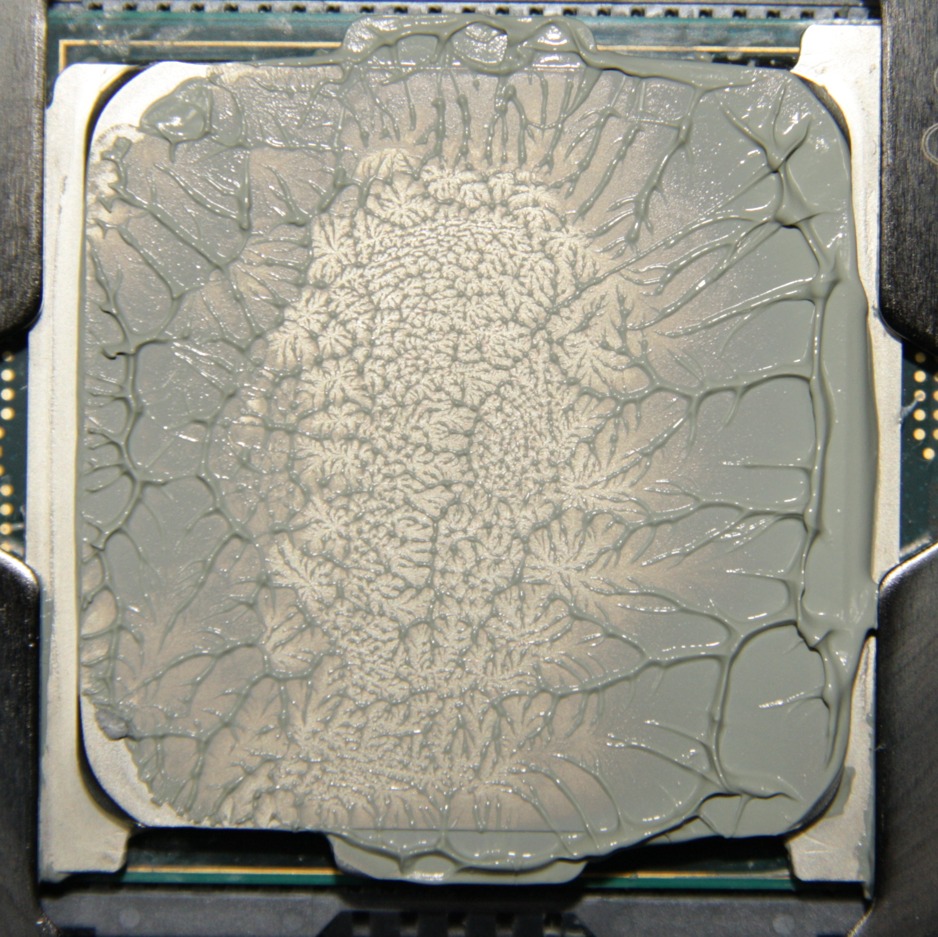 Видно, что термопаста распределилась почти по всей площади крышки процессора, и ее излишки выдавились за края. В центре есть большая область плотного контакта.