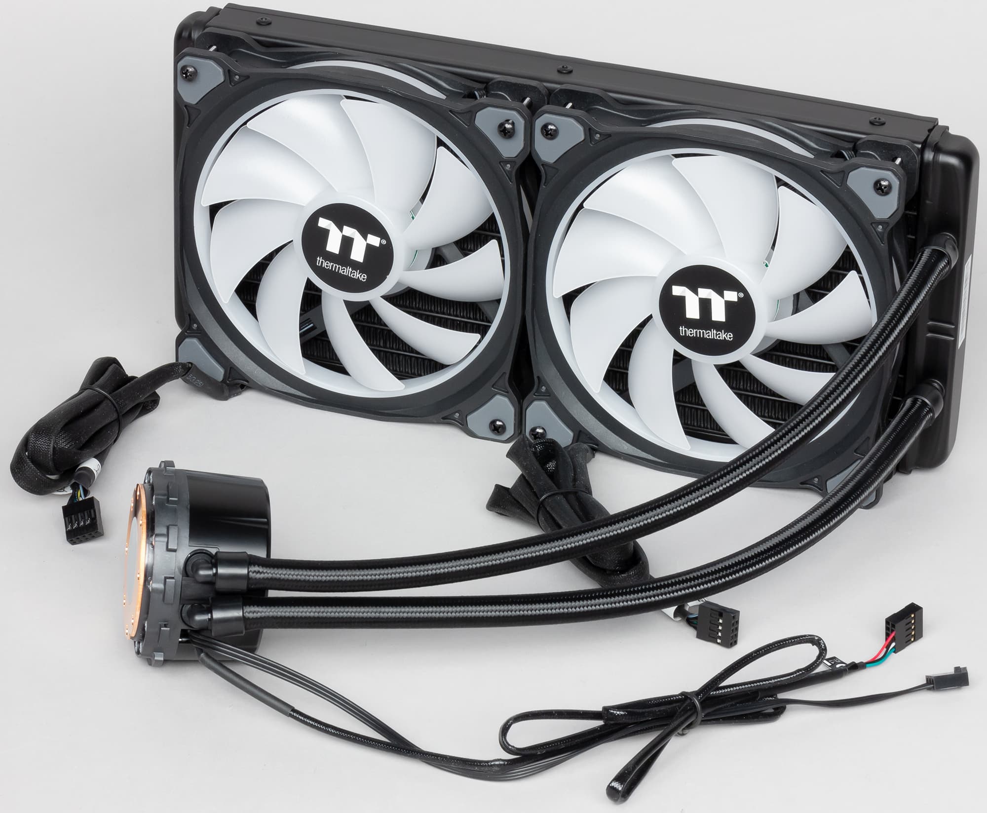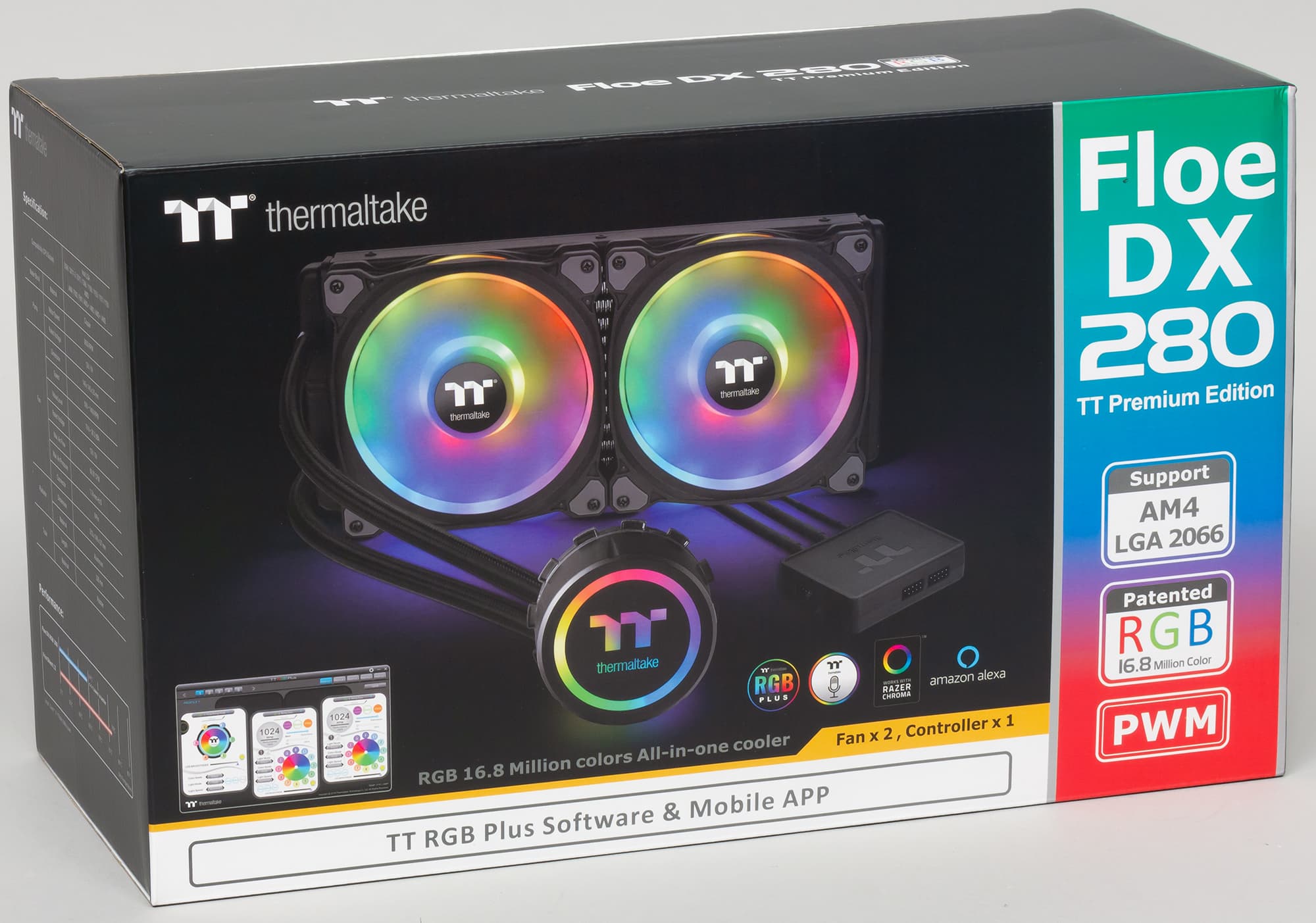 На основе системы жидкостного охлаждения Thermaltake Floe DX RGB 280 TT Premium Edition можно создать условно бесшумный компьютер (уровень шума 25 дБА и ниже), оснащенный процессором типа Intel Core i9-7980XE (Intel LGA2066, Skylake-X (HCC)), если потребление процессора под максимальной нагрузкой не будет превышать 240 Вт, а температура внутри корпуса не повысится выше 44 °C. При снижении температуры охлаждающего воздуха и/или менее жестких требованиях к уровню шума пределы мощности можно существенно увеличить. Особенностью системы является многоцветная и многозонная статичная или динамичная подсветка вентиляторов и помпы. Вентиляторы Riing Duo RGB выглядят весьма эффектно, так как RGB-светодиодами освещаются два кольца — внутреннее и внешнее. Управлять и контролировать работу вентиляторов, а также настраивать подсветку вентиляторов и помпы можно с помощью приложения на стационарном компьютере и его помощника на мобильном устройстве. Отметим хорошее качество изготовления, оплетку большинства кабелей и шлангов (как минимум помогающую сохранить единый стиль оформления внутренностей компьютера), длинные кабели к вентиляторам, антивибрационные вставки в рамке вентиляторов. Для обеспечения очень тихой работы не очень мощных систем напряжение питания помпы можно понизить где-то до 8 В, так как на 12 В помпа работает относительно громко.