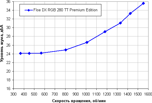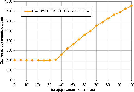 Диапазон регулировки скорости вращения довольно широкий, есть плавный близкий к линейному рост скорости вращения при изменении коэффициента заполнения (КЗ) от 35% до 100%. Отметим, что при КЗ 0% вентиляторы не останавливаются, что может иметь значение в гибридной системе охлаждения с пассивным режимом на минимальной нагрузке.