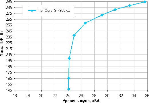 Приняв 25 дБА за критерий условной бесшумности, получим примерную максимальную мощность процессора, соответствующих этому уровню. Это порядка 240 Вт для процессора Intel Core i9-7980XE. Если не обращать внимания на уровень шума, то пределы мощности можно увеличить где-то до 295 Вт. Еще раз уточним: это в жестких условиях обдува радиатора нагретым до 44 градусов воздухом, а при снижении температуры воздуха указанные пределы мощности для бесшумной работы и максимальной мощности возрастают.