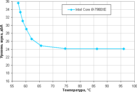 В этом тесте наш процессор Intel Core i9-7980XE не перегревается (при 24 градусов окружающего воздуха) даже на оборотах вентиляторов, равных минимальному значению, достигаемому с помощью изменения КЗ. Можно даже понизить напряжение до 10 В, что при КЗ = 30% соответствует примерно 340 об/мин (первая точка на графике), но температура при этом уже близка к критической.