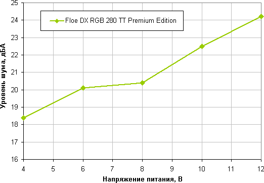 Зависит, конечно, от индивидуальных особенностей и других факторов, но где-то от 40 дБА и выше шум, с нашей точки зрения, очень высокий для настольной системы; от 35 до 40 дБА уровень шума относится к разряду терпимых; ниже 35 дБА шум от системы охлаждения не будет сильно выделяться на фоне типичных небесшумных компонентов ПК — корпусных вентиляторов, вентиляторов на блоке питания и на видеокарте, а также жестких дисков; а где-то ниже 25 дБА кулер можно назвать условно бесшумным. В данном случае СЖО работает относительно тихо. Однако даже на минимальной скорости вращения вентиляторов шум от системы довольно высокий, порядка 24 дБА. Причина в помпе — она работает не очень тихо. Приведем зависимость уровня шума только помпы от напряжения питания.