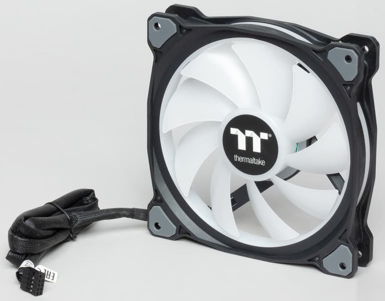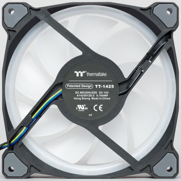 Рамка вентилятора состоит из двух половинок из черного пластика, которые между собой зажимают светорассеиватель из белого полупрозрачного пластика. Светорассеиватель видно как снаружи, так и изнутри, при этом он еще немного выступает внутрь обода вентилятора. В светорассеиватель с равным шагом вмонтированы 12 многоцветных светодиодов. Итого всего в вентиляторе Riing Duo RGB 18 адресуемых независимо управляемых RGB-светодиодов. В проушины в углах рамки вентилятора вклеены виброизолирующие накладки из упругого пластика средней жесткости и серого цвета. В несжатом состоянии накладки выступают примерно на 0,5 мм. По замыслу разработчиков, это должно обеспечивать виброразвязку вентилятора от места крепления. Однако если прикинуть соотношение массы вентилятора к жесткости накладок, то становится понятно, что резонансная частота конструкции получается очень высокой, то есть практически никакой эффективной виброразвязки быть не может. В итоге, такую конструкцию проушин можно рассматривать в качестве элемента дизайна вентилятора. Маркировка на вентиляторе позволяет определить, что используется модель TT-1425 компании Hong Sheng.
