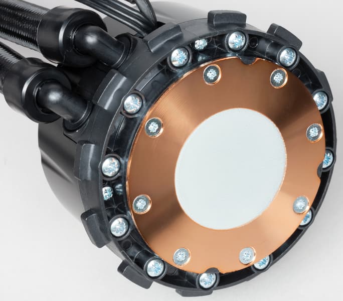 Система герметичная, заправлена, и готова к использованию. Помпа интегрирована в один блок с теплосъемником. Подошвой теплосъемника, непосредственно прилегающей к крышке процессора, служит медная пластина. Ее внешняя поверхность имеет очень мелкую сглаженную концентрическую проточку, как будто она сточена на токарном станке и слегка отполирована. К центру поверхность выпуклая с перепадом порядка 0,3 мм.