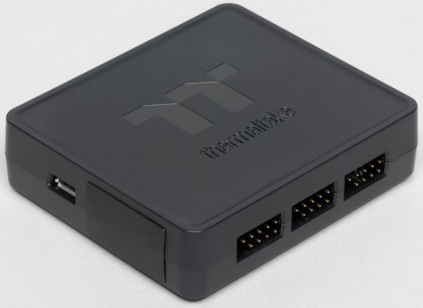 Управление работой вентиляторов и подсветкой вентиляторов и помпы осуществляется с помощью контроллера. Он представляет собой черную коробочку из пластмассы размером 75 на 65 на 20 мм. Контроллер можно закрепить в корпусе ПК с помощью двух полосок с клейким слоем.