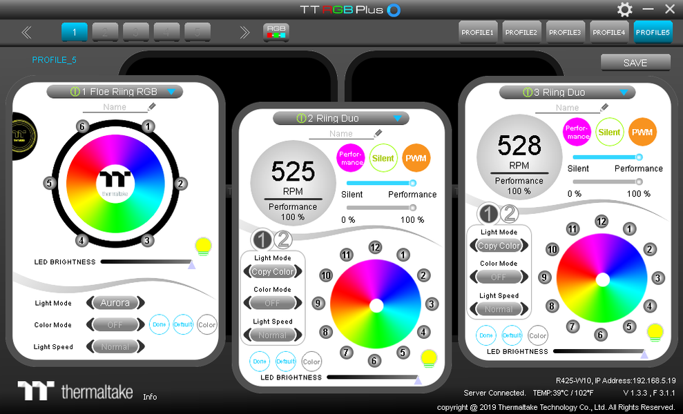 Управление вентиляторами и подсветкой помпы осуществляется с помощью ПО TT RGB Plus, работающего под ОС Windows версии 7 и выше. Эту программу нужно загрузить с сайта производителя. В окне программы размещено три панели управления на переднем плане и две на заднем, последние при смене фокуса перемещаются на передний план. Контроллер, к которому относятся эти панели, выбирается вверху слева.
