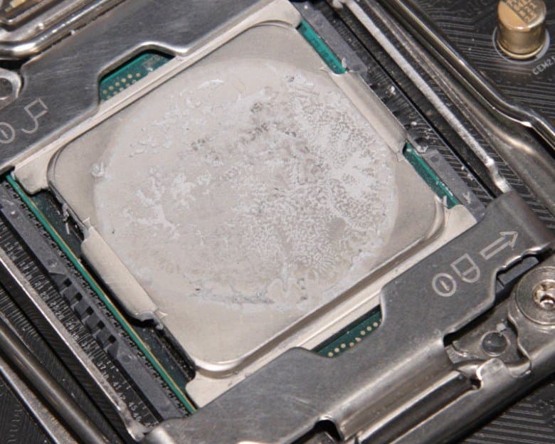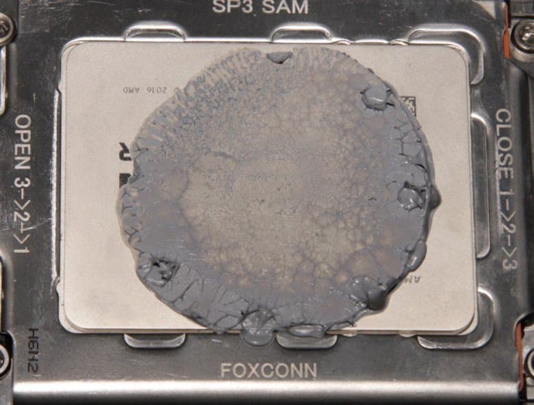 В качестве дополнительного теста мы решили посмотреть как система Floe Riing RGB 360 TT Premium Edition справится с охлаждением процессора AMD Ryzen Threadripper. Термопасты взяли с избытком, так, что она заполнила всю рабочую поверхность теплосъемника помпы, при этом в центральной выпуклой части получился слой минимальной толщины. Фотографии ниже, сделанные после завершения теста, это демонстрируют. На процессоре: