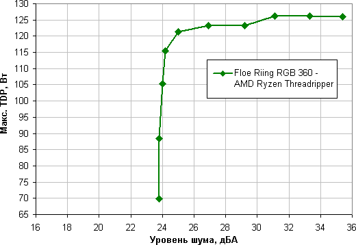 По данной ссылке можно рассчитать пределы мощности для других граничных условий (температуры воздуха и максимальной температуры процессора) и сравнить систему Floe Riing RGB 360 TT Premium Edition с несколькими другими, также с радиатором на три вентилятора 120 мм и протестированными по такой же методике (список систем пополняется).