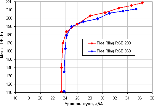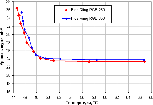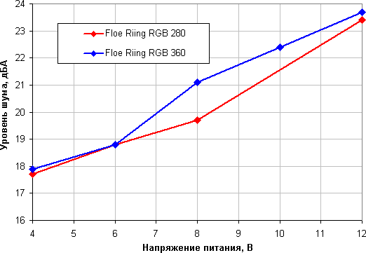Шум только от работающей помпы при питании от 12 В составил 23,4 дБА (система 280) и 23,7 дБА (система 360). Помпы не являются очень тихими. Приведем зависимость уровня шума только помпы от напряжения.