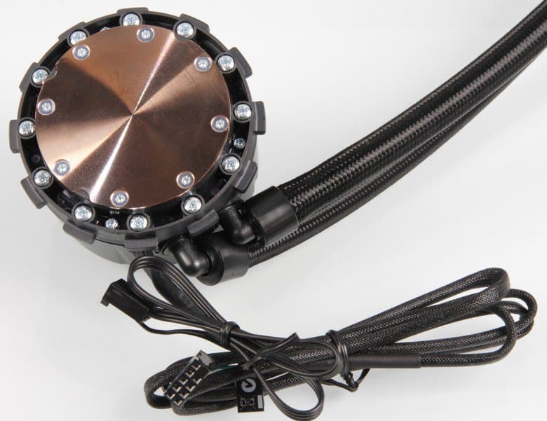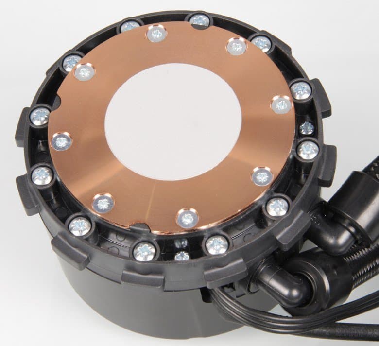 Система герметичная, заправлена, и готова к использованию. Помпа интегрирована в один блок с теплосъемником. Подошвой теплосъемника, непосредственно прилегающей к крышке процессора, служит медная пластина. Ее внешняя поверхность имеет очень мелкую сглаженную концентрическую проточку, как будто она сточена на токарном станке и слегка отполирована. К центру поверхность выпуклая с перепадом порядка 0,5 мм.