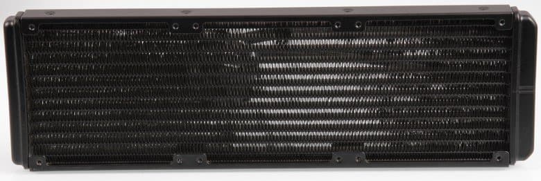 Г-образные фитинги на входе в помпу поворачиваются, что облегчает установку системы. Радиатор изготовлен из алюминия и снаружи имеет черное матовое не очень стойкое покрытие. Габариты радиатора — 312,5×140×27 мм.
