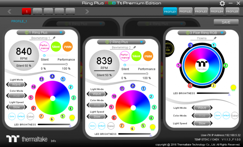 Управление вентиляторами и подсветкой помпы осуществляется с помощью ПО Riing Plus RGB Tt Premium Edition, работающего под ОС Windows версии 7 и выше. Эту программу нужно загрузить с сайта производителя. В окне программы размещено три панели управления на переднем плане и две на заднем, последние при смене фокуса перемещаются на передний план. Контроллер, к которому относятся эти панели, выбирается вверху слева.