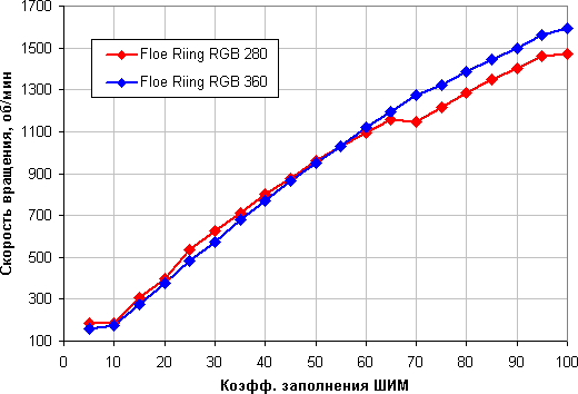 Отличный результат — плавный рост скорости вращения при изменении коэффициента заполнения от 10% до 100%. Нарушение равномерности роста в одном месте, видимо, вызвано каким-то внешним фактором. Отметим, что при КЗ 0% (точнее, меньше 2% (TT-1225) или 3% (TT-1425)) вентиляторы останавливаются, что может пригодиться в гибридной системе охлаждения с пассивным режимом на минимальной нагрузке. Запускаются вентиляторы при КЗ 6% (запуск с раскруткой).