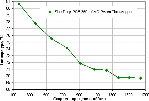 Зависимость температуры процессора AMD Ryzen Threadripper при его полной загрузке от скорости вращения вентиляторов кулера: