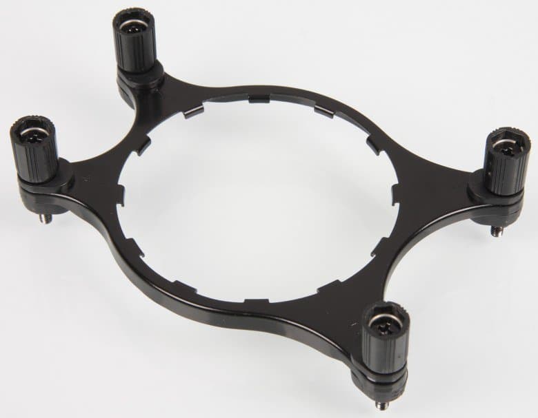 Крепеж изготовлен в основном из закаленной стали и имеет стойкое гальваническое покрытие. Рамка на обратную сторону системной платы изготовлена из пластика, впрочем, резьбовые отверстия в ее подвижных вставках по углам все равно в металлических втулках. Отметим, что гайки с насечкой имеют относительно большой диаметр, поэтому их спокойно можно закручивать руками, не используя отвертку. Стойки шестигранные, что также удобно при установки и снятии водоблока.