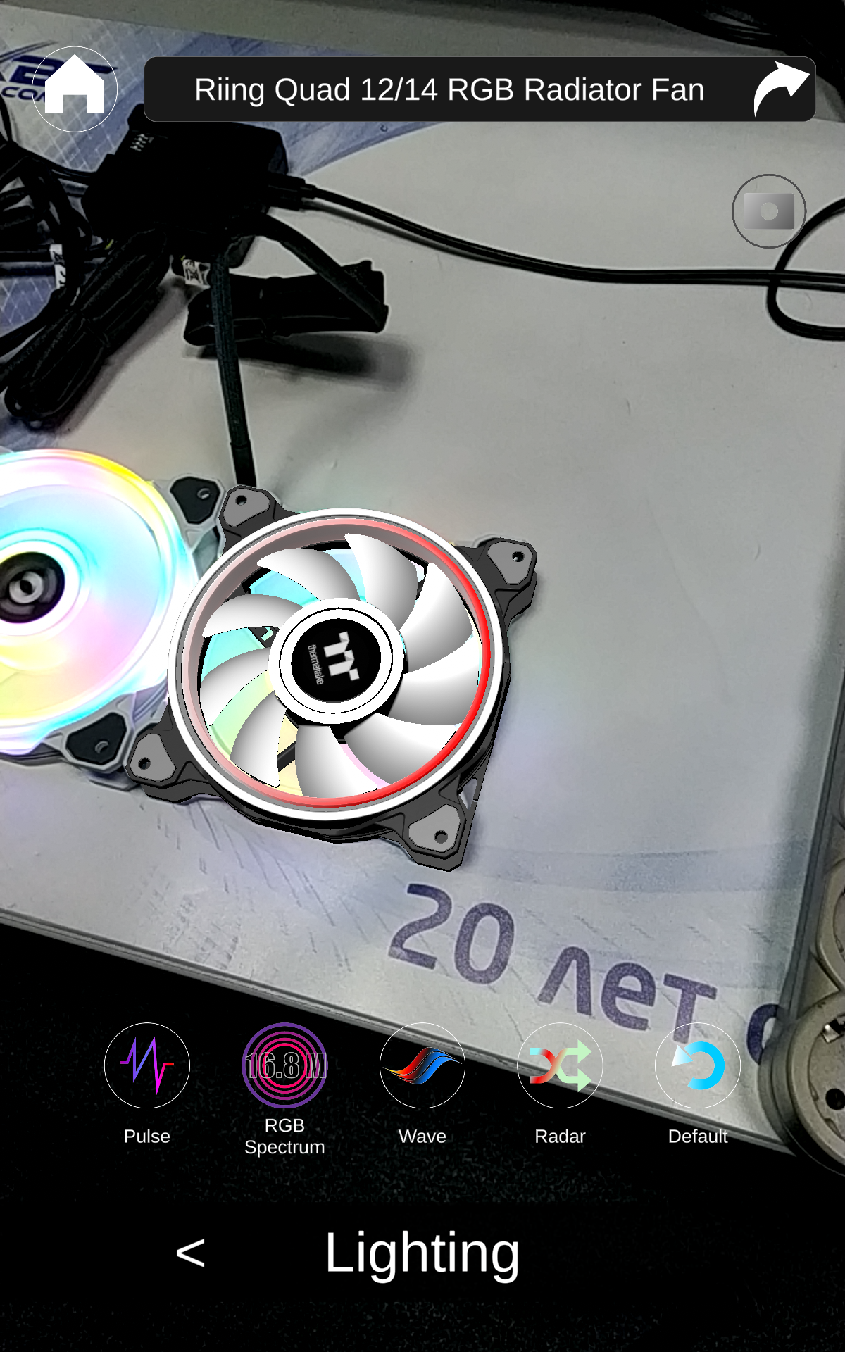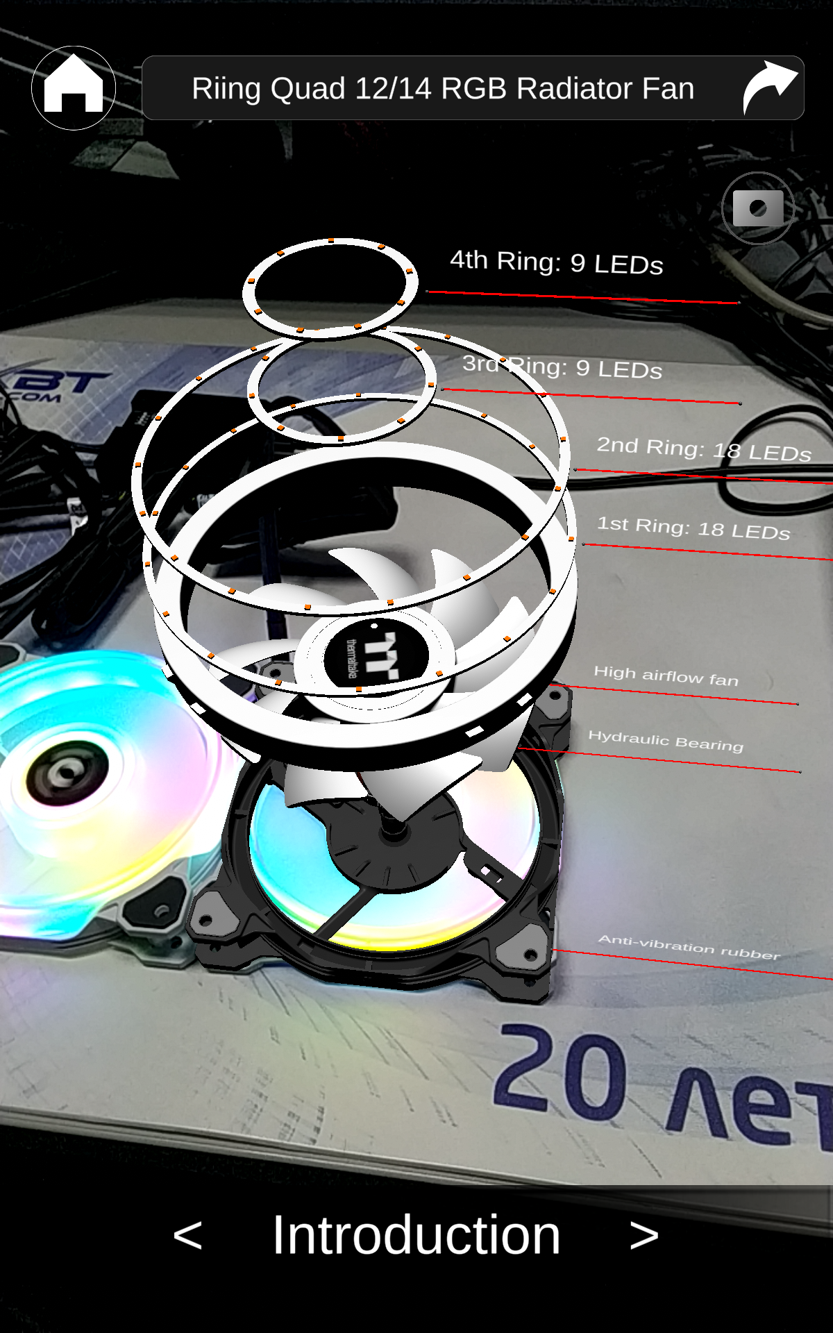 Компания Thermaltake также предлагает приложение дополненной реальности ARTT. На момент написания статьи поддерживаются, видимо, только вентиляторы Riing Quad и модули памяти с подсветкой ToughRam RGB. Если навести камеру на вентиляторы, то программа их распознает и далее будет дорисовывать в реальном времени табличку с характеристиками, покомпонентный рисунок, поясняющий устройство вентиляторов, или то, как будет выглядеть выбранный вариант подсветки. Практической пользы от этой программы мало, но разок побаловаться можно.