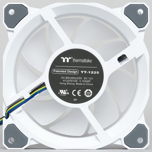 В несжатом состоянии накладки выступают примерно на 0,5 мм. По замыслу разработчиков, это должно обеспечивать виброразвязку вентилятора от места крепления. Однако если прикинуть соотношение массы вентилятора к жесткости накладок, то становится понятно, что резонансная частота конструкции получается очень высокой, то есть практически никакой эффективной виброразвязки быть не может. Кроме того, гнезда, куда вворачиваются крепежные саморезы, являются частью рамки вентилятора, поэтому вибрация от вентилятора будет через саморезы без помех передаваться на то, на чем закреплен вентилятор. В итоге, такую конструкцию проушин можно рассматривать только в качестве элемента дизайна вентилятора. Маркировка на вентиляторе позволяет определить, что используется модель TT-1225 (A1225S12S), произведенная компанией Hong Sheng. Впрочем, это общее обозначение нескольких моделей вентиляторов, в лучшем случае оно относится к мотору крыльчатки.