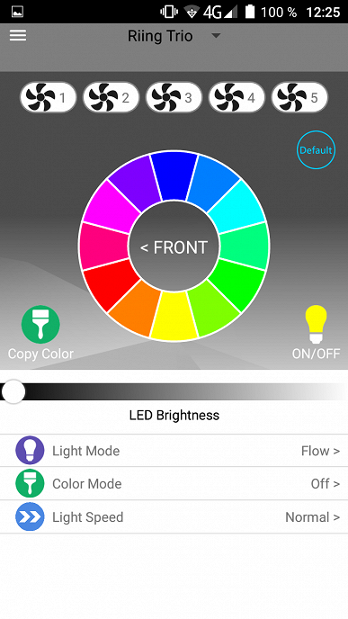 Пользователь может вручную управлять скоростью вращения вентилятора (изменяя коэффициент заполнения ШИМ), или может включить один из двух автоматических режимов (тихий и производительный), в которых скорость вращения будет расти с ростом температуры процессора. Также пользователю доступно управление подсветкой вентиляторов (и помпы): выбор одного из вариантов статичного или динамичного режимов, подсветку можно включить-выключить, изменить скорость для динамичных режимов, а также в зависимости от режима установить общий цвет или цвет каждого светодиода из 12 для вентиляторов и из 6 для помпы. Среди режимов есть вариант привязки мигания подсветки к источнику звука. Режим подсветки можно скопировать с соседней панели, также можно сохранить режимы всех панелей в выбранном профиле. При остановке вентилятора или невозможности его обнаружения на панели появляется предупреждающее сообщение. Часть режимов подсветки можно посмотреть на видео к данной статье и в ролике ниже (музыка: Bensound’s Royalty Free Music):