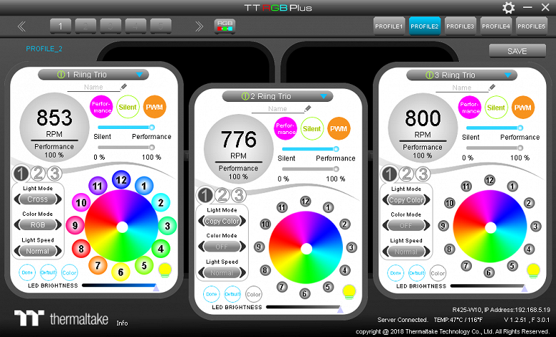 Управление вентиляторами и подсветкой помпы осуществляется с помощью ПО TT RGB Plus, работающего под ОС Windows версии 7 и выше. Эту программу нужно загрузить с сайта производителя. В окне программы размещено три панели управления на переднем плане и две на заднем, последние при смене фокуса перемещаются на передний план. Контроллер, к которому относятся эти панели, выбирается вверху слева.