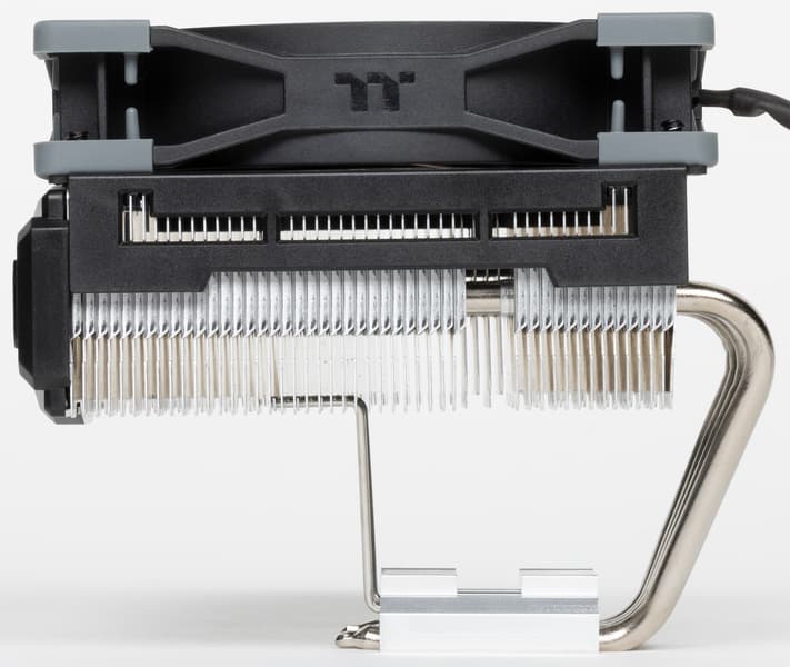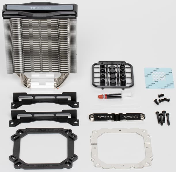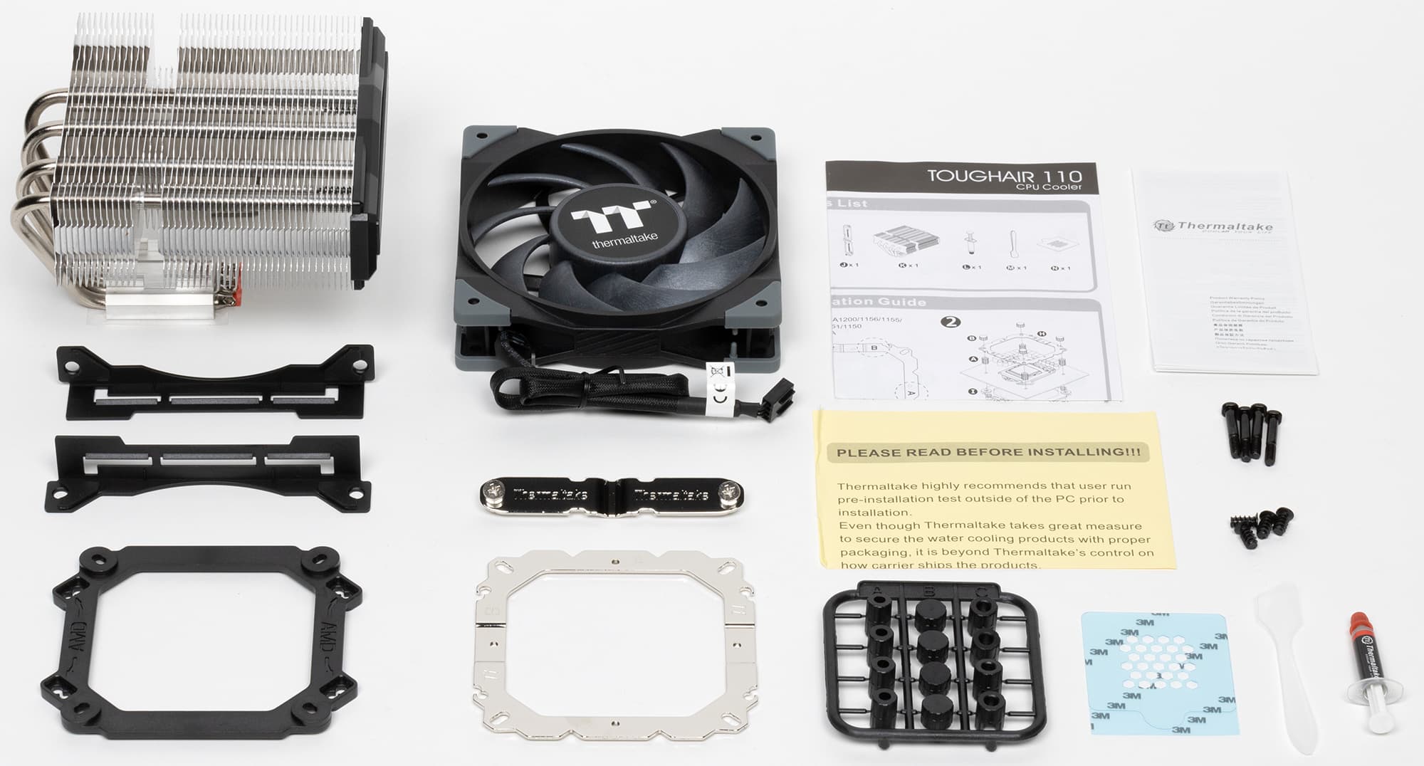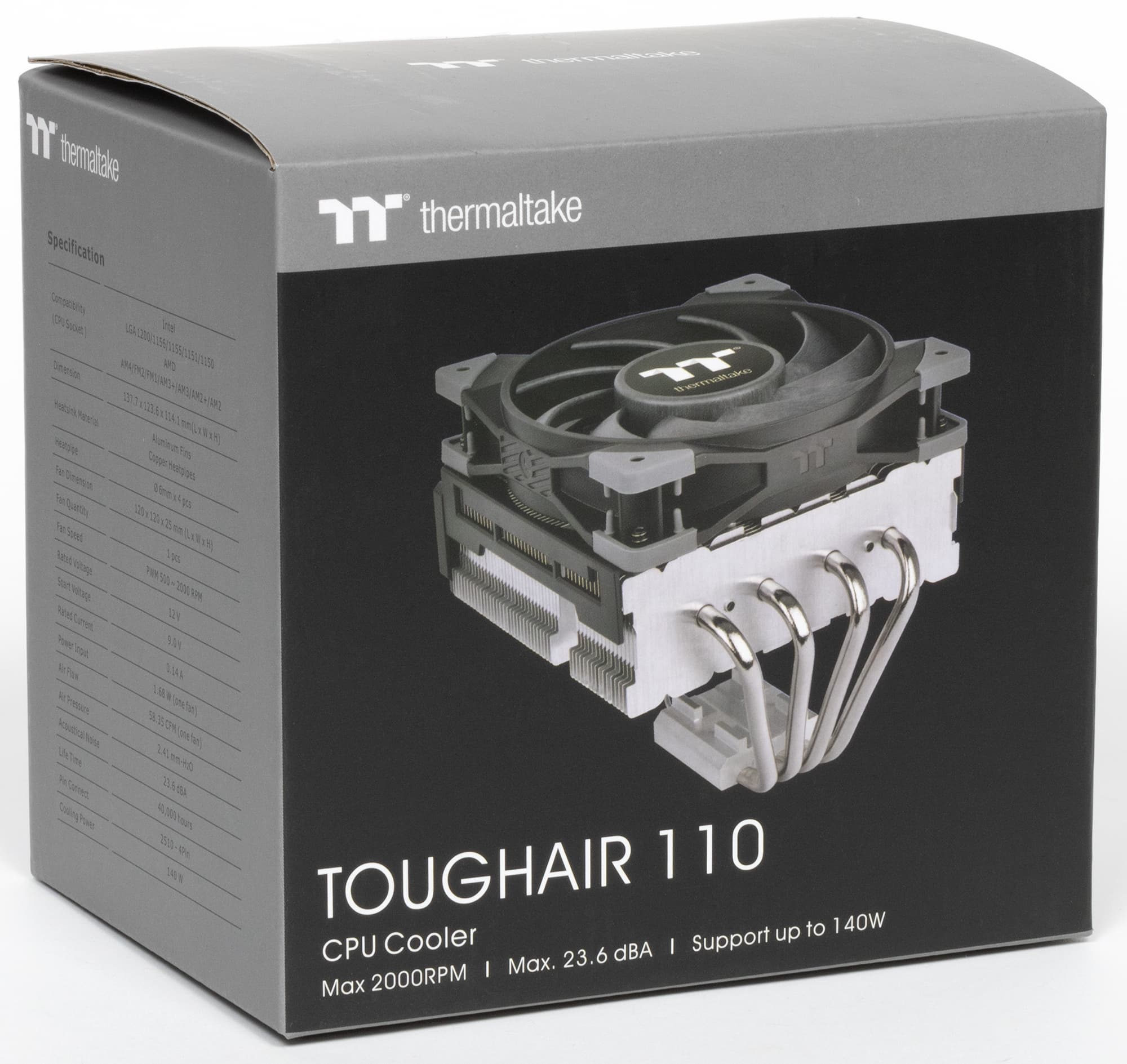 В комплекте идет инструкция по установке хорошего полиграфического качества в виде листка формата А4. Информация в основном представлена в виде картинок-схем. На сайте компании мы нашли ссылки на инструкции в виде файлов PDF. Оба кулера оснащены вынесенным радиатором, к которому тепло от процессора передается по четырем тепловым трубкам. У ToughAir 110 радиатор горизонтальный и вентилятор, закрепленный сверху, дует вниз. Такая конструкция уменьшает высоту кулера и способствует лучшему охлаждению компонентов системной платы, расположенных около процессорного гнезда.