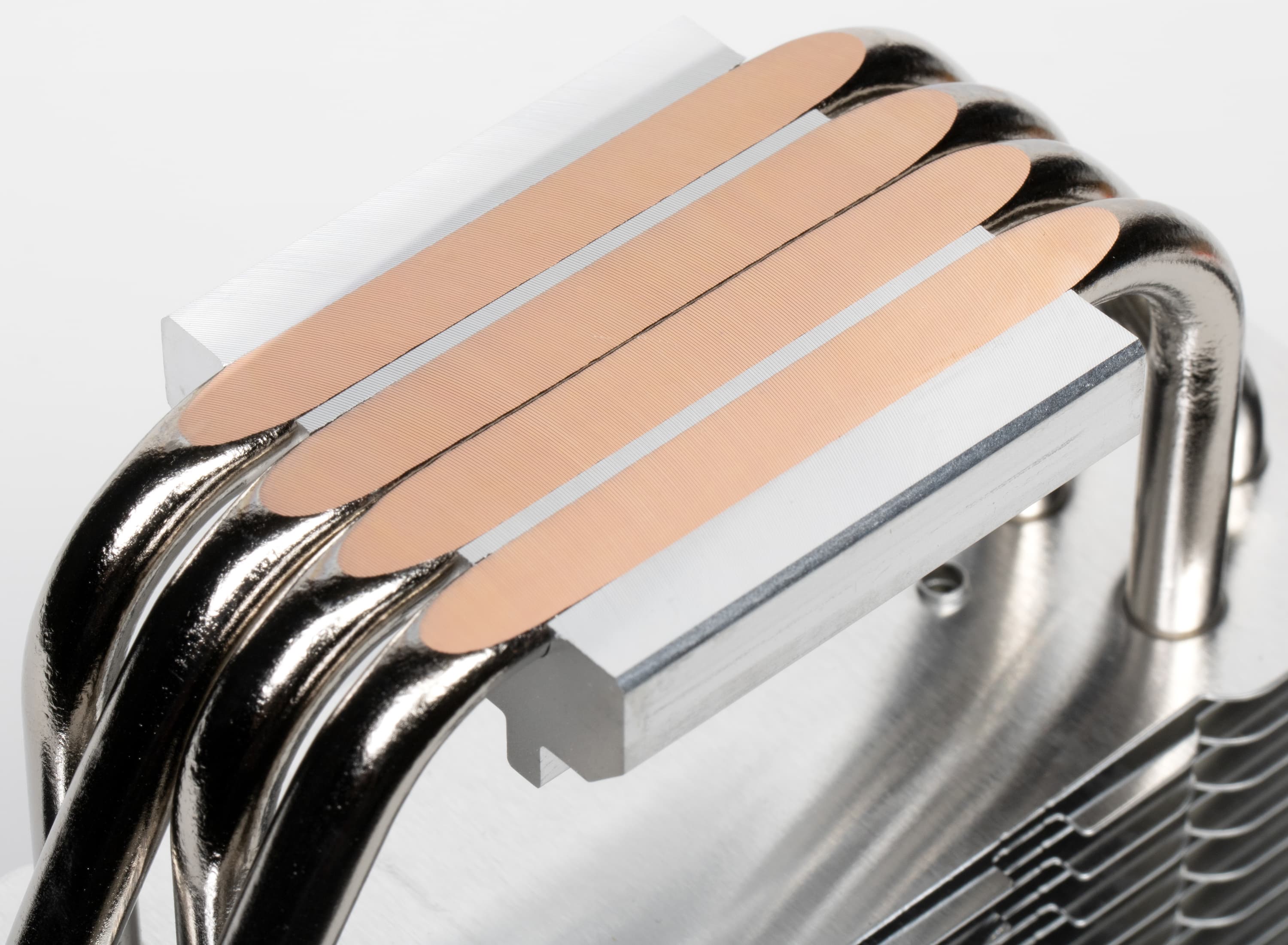 Тепловые трубки, разумеется, медные. Снаружи они никелированные. У основания кулера трубки сплющены, впрессованы в канавки и зашлифованы в одну плоскость с нижней поверхностью изготовленного из алюминия теплосъемника. Получившаяся в результате контактная поверхность почти идеально плоская и очень ровная, заметная канавка есть только между двумя центральными трубками.