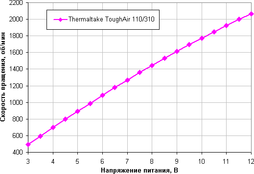 Диапазон регулировки с помощью напряжения в данном случае примерно такой же. Вентилятор останавливается при снижении напряжения до 2,7 В и запускается от 2,9 В. Вентилятор вполне допустимо подключать к источнику с напряжением 5 В.