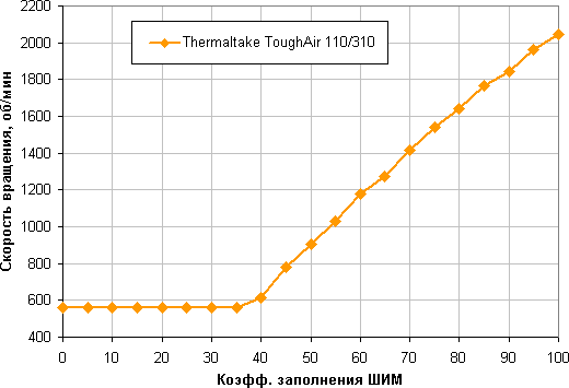 Хороший результат — практически линейный рост скорости вращения при изменении коэффициента заполнения (КЗ) от 35% до 100% и довольно широкий диапазон регулировки. Отметим, что при КЗ 0% вентилятор не останавливается, поэтому в гибридной системе охлаждения с пассивным режимом на минимальной нагрузке такие вентиляторы придется останавливать, снижая напряжение питания.