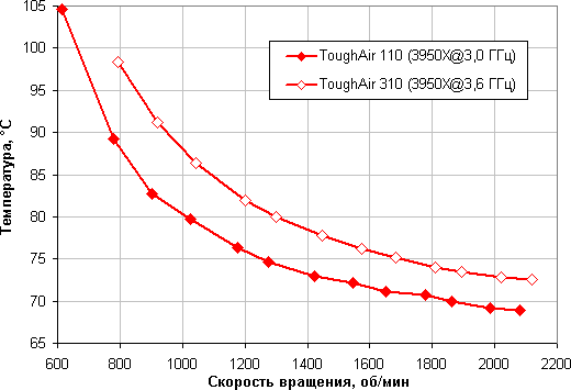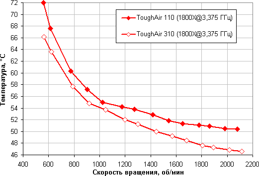 Второй рисунок наглядно показывает, что охлаждающая способность у ToughAir 310 при тех же скоростях вентилятора выше. Видимо, это обусловлено чуть большим размером радиатора, увеличенной длиной тепловых трубок, дважды проходящих через радиатор, и лучшим обдувом вертикально расположенного радиатора.
