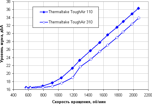 Зависит, конечно, от индивидуальных особенностей и других факторов, но в случае кулеров где-то от 40 дБА и выше шум с нашей точки зрения очень высокий для настольной системы, от 35 до 40 дБА уровень шума относится к разряду терпимых, ниже 35 дБА шум от системы охлаждения не будет сильно выделяться на фоне типичных небесшумных компонентов ПК — вентиляторов корпусных, на блоке питания, на видеокарте, а также жестких дисков, а где-то ниже 25 дБА кулер можно назвать условно бесшумным. Фоновый уровень был равен 16,2 дБА (условное значение, которое показывает шумомер). Оба кулера можно считать относительно тихими устройствами. Однако ToughAir 110 немного более шумный — возможно, это связано с особенностями выдува вниз.