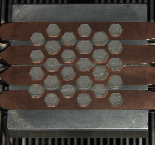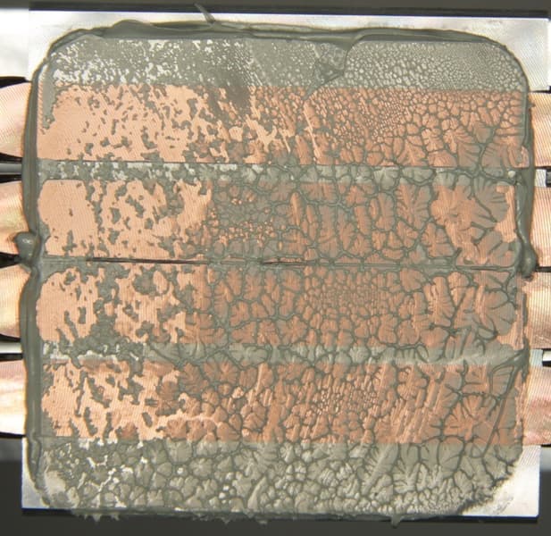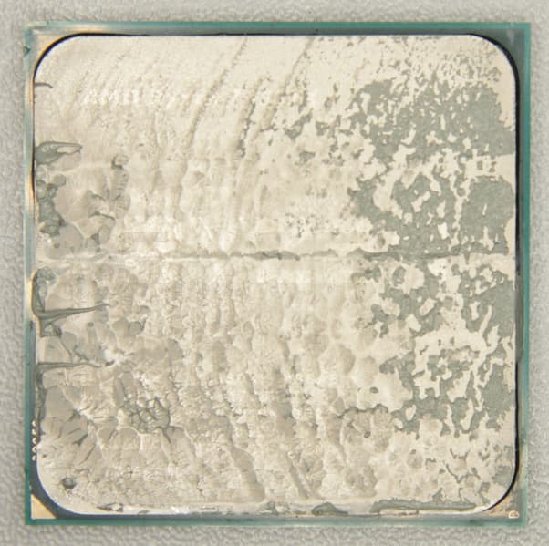 Способ интересный, но в тестах его мы не применяли, а использовали привычное точечное нанесение с последующим тщательным притиранием поверхностей кулера и процессора. В тестах использовалась не менее качественная термопаста другого производителя. Забегая вперед, продемонстрируем распределение термопасты после завершения всех тестов. На процессоре AMD Ryzen 9 3950X: