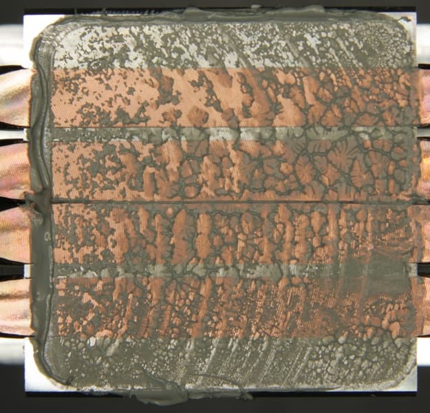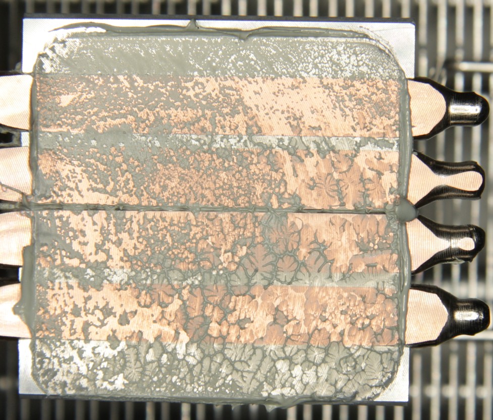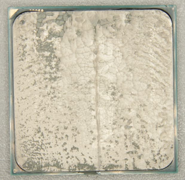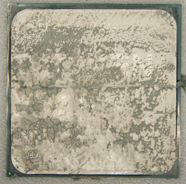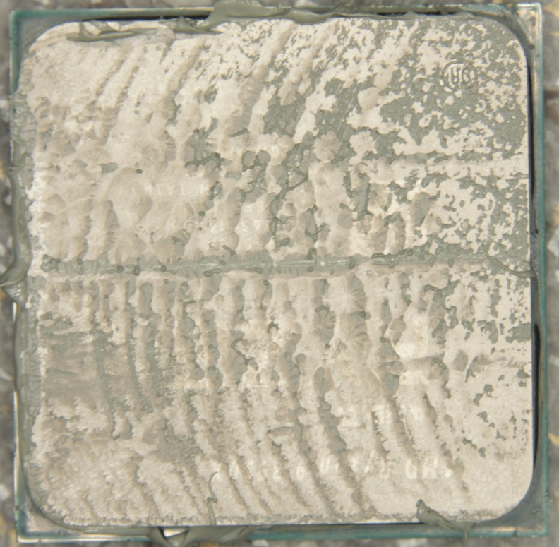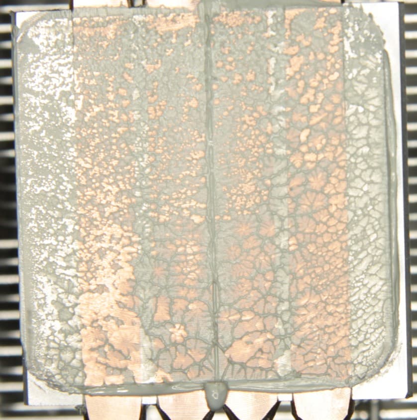 Видно, что термопаста распределилась очень тонким слоем по всей плоскости крышки процессора, а ее избыток выдавился по краям. Область плотного контакта максимально большая.