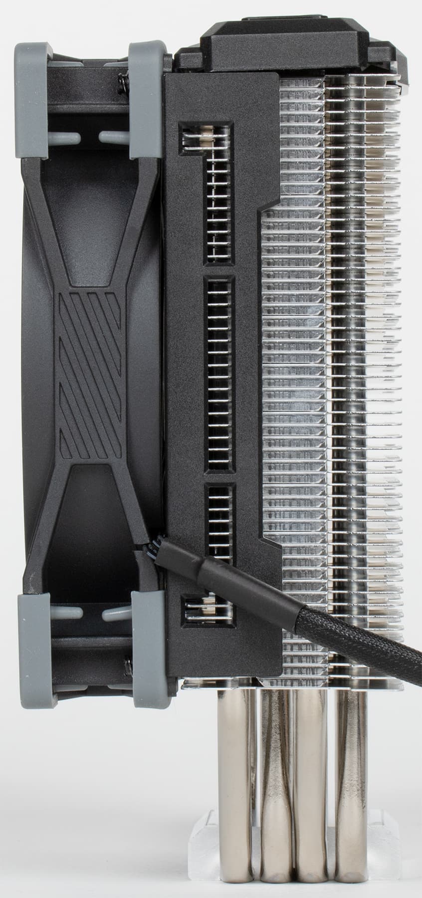 Вентилятор кулера имеет четырехконтактный разъем (общий, питание, датчик вращения и управление ШИМ) на конце кабеля. Кабель заключен в скользкую плетеную оболочку. Согласно легенде, оболочка уменьшает аэродинамическое сопротивление, но принимая во внимание толщину плоского четырехпроводного кабеля внутри этой оболочки и ее внешний диаметр, мы в правдивости этой легенды сильно сомневаемся. Впрочем, оболочка позволит сохранить единый стиль оформления внутреннего убранства корпуса.